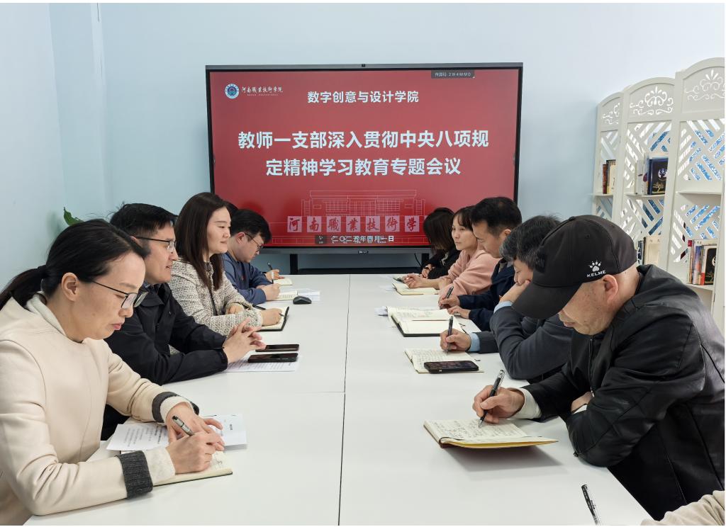 4月1日下午,学校数字创意与设计学院教师第一党支部召开深入贯彻中央八项规定精神学习教育集中学习会。校党委委员、副校长任枫轩以普通党员身份参会,集中学习中央八项规定精神,并交流心得体会。