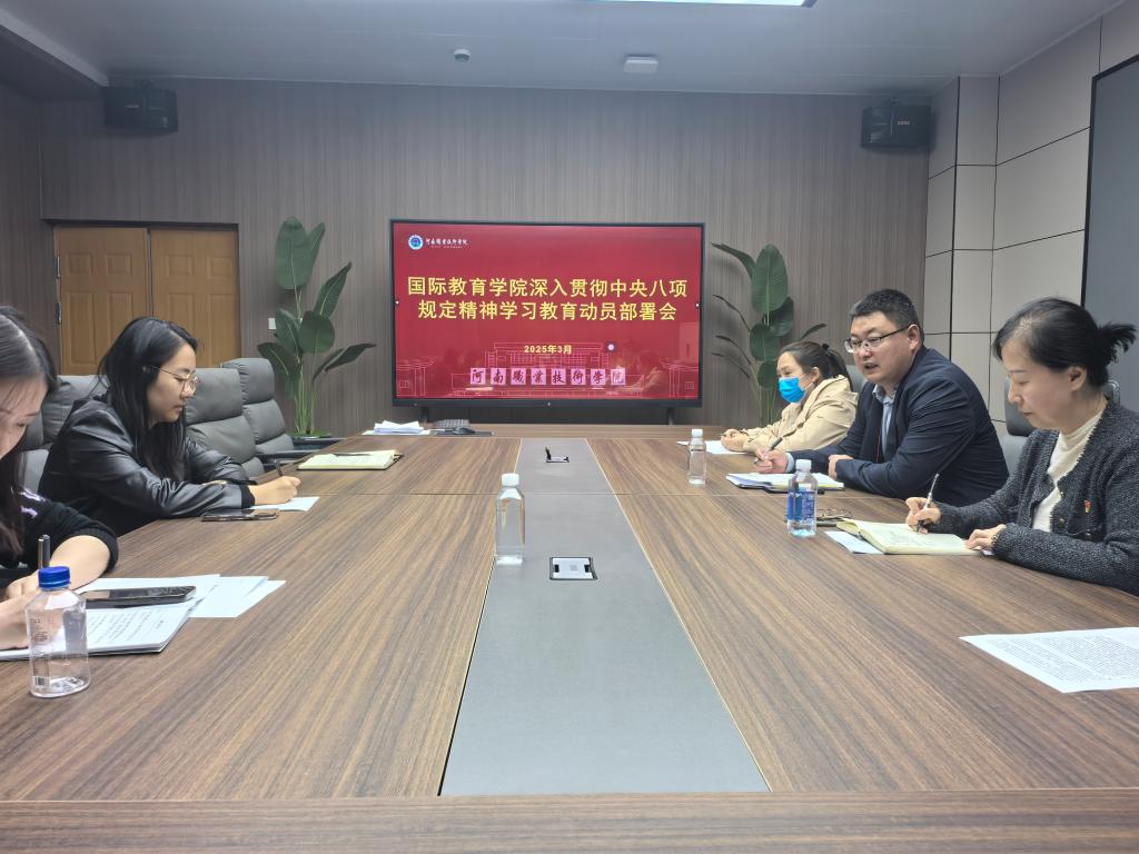 3月25日下午,学校国际教育学院召开党支部委员会扩大会议,专题部署深入贯彻中央八项规定精神学习教育工作。党支部书记解鹏程主持会议,党支部委员、委员候选人和组织员参加会议。
