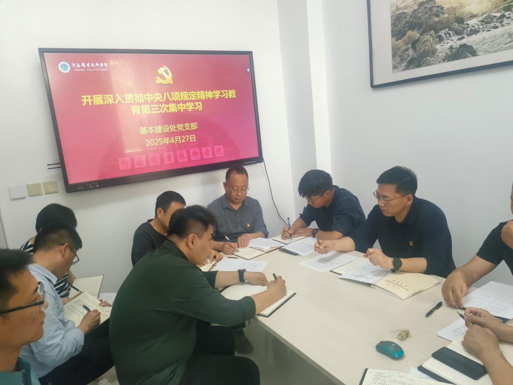4月27日上午,学校基本建设处党支部在行政楼322会议室组织开展深入贯彻中央八项规定精神学习教育第三次集中学习。会议由支部书记吴玉刚主持,全体党员参加学习。