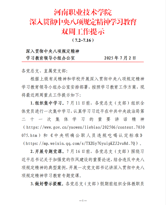 河南职业技术学院深入贯彻中央八项规定精神学习教育双周工作提示