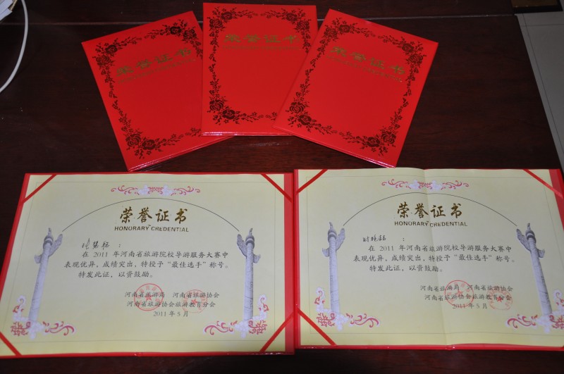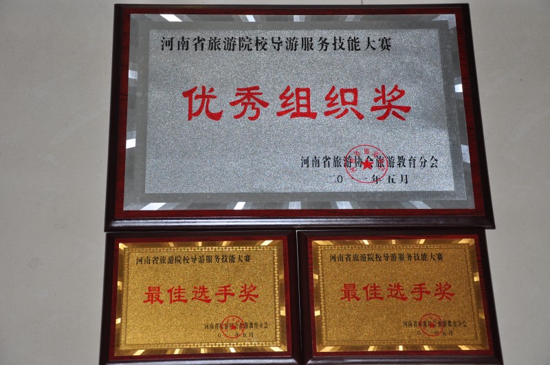 5月27日,“中原福塔杯”河南省旅游院校第一届服务技能(导游服务)大赛在郑州落下帷幕。旅游烹饪系09级旅游英语专业张慧聪和旅游管理专业时艳喆同学代表学院参加了比赛,经过“现场讲解、专业笔试、才艺展示”三个环节的激烈角逐,两名选手双双获得本次大赛最高奖项一等奖,总成绩名列34支参赛队伍的第一名;时艳喆同学在现场讲解中以其独特精彩的讲解征服了全场的评委及观众,夺得了大赛最高分,并荣获“最佳讲解奖”,充分展示了我院旅游专业的办学水平和人才培养上的实力。由于大赛成绩突出,组委会对我院颁发了“优秀组织奖”。