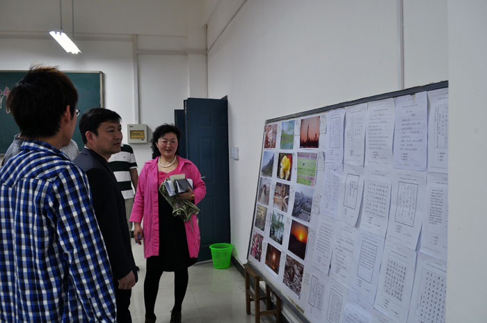 4月26日上午,由河南财经政法大学艺术系杨新宇主任和河南科技大学艺术与设计学院蒋鑫院长组成的“河南省第三届大学生艺术展演活动”专项工作检查组来汽车工程系实训楼505室参观“沐春风、浴古韵”书画摄影展览。