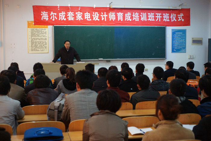 3月23日上午,海尔成套家电设计师育成培训班开班仪式在我院举行。学院院长王爱群、副院长肖珑、郑州海尔工贸有限公司刘毕成总经理和环境艺术工程系负责人、海尔青岛总部培训项目负责人参加了开班仪式。此次60余人的首批培训将进行为期15天的企业文化、家居设计、家电设计和营销知识、模拟训练等专业知识的封闭训练。