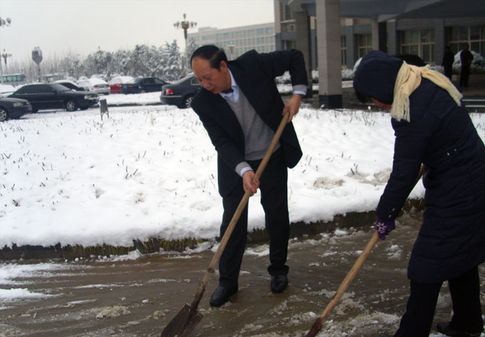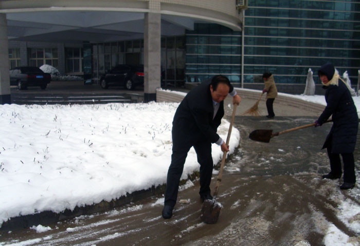 3月1日一上班,学院后勤处、保卫处等部门的职工拿着铁锨、扫帚开始了铲雪、除冰的活动。学院党委书记王长钦同志一下车就和职工一道参与了铲雪行动,大家一起清扫了学院大门口、行政楼前等处的积雪。经过近一个小时的紧张劳动,学院大门口、行政楼前已清理出了一条通道。