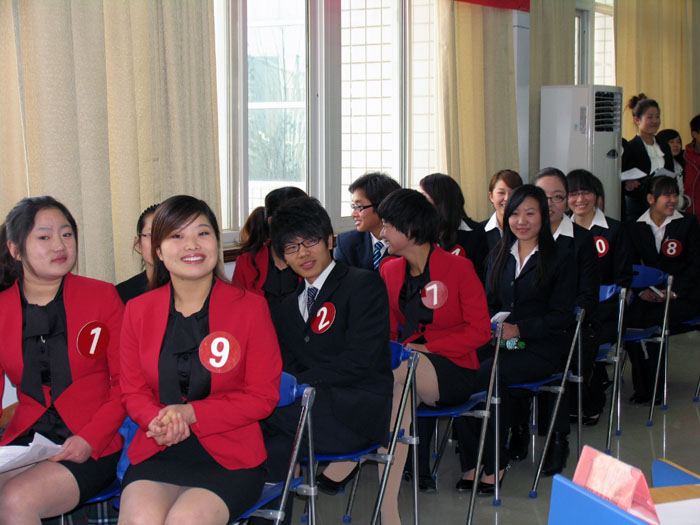 与往届大赛不同的是,此次决赛增加了无领导小组讨论和职业模仿秀环节。在无领导小组讨论比赛中,要求所有选手抽签分为两组,各组按照某个情境进行分析和讨论,根据每位选手在讨论中的表现打分。同时要求,每位选手依据自己的目标职业进行岗位工作模仿。决赛现场气氛活跃、热烈,每位参赛选手所在系都组织了拉拉队,为他们助阵、加油。