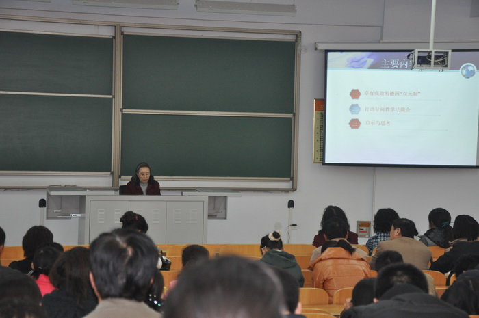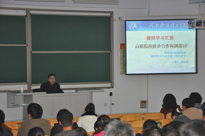 在汇报会上,教务处长王卫平教授、机电系副主任李伟教授、机电系数控技术教研室主任赵军华副教授和汽车工程系实训中心王文副主任等四位学员就赴德培训的内容、学习体会以及差异比较等分别进行了专题汇报。他们用充满激情的语言、图文并茂的课件,展示了德国职业教育丰富多样的行动导向教学法,工作过程系统化的课程开发理念,立交桥式的教育体系结构等进修学习的收获和成果,向大家讲述了培训前后认识的转变。整场汇报气氛热烈,与会教师强烈地感受到异域教育文化的冲击,为我院向纵深推进校企合作、工学结合、顶岗实习人才培养模式创新和教育教学改革开拓了思路。