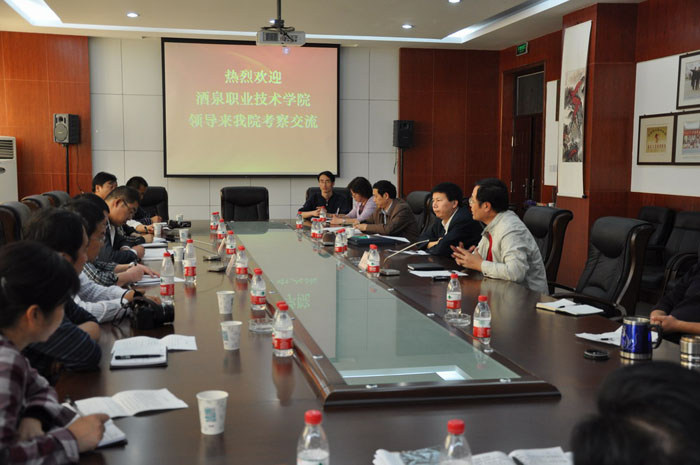 吴建春副院长首先介绍了酒泉职业技术学院的概况,以及此次交流学习的内容和目的。彭院长对兄弟院校的来访表示欢迎,并详细介绍了我院的发展历程和示范性高职院校项目的申报与建设工作,重点介绍了我院在项目建设中的特色与优势,如“订单式”人才培养模式、能力本位的教学理念、“讲-演-练-评”四位一体的实践教学模式、双师队伍建设、学生就业工作的成绩(我院学生就业工作进入全国高校前50名)以及通过举办河南省各类技能大赛服务社会等相关方面的工作。最后彭院长又与客人探讨了在项目建设中遇到的困难以及在诸如兼职教师的聘请和学生顶岗实习等方面的不足。吴院长赞扬我院在近年发展中取得的成就,并表示我院各方面的工作经验会对自己学院的发展将有很大的借鉴和启示。