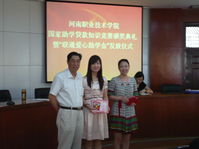 6月25日上午,我院在行政楼圆形会议室举行了国家助学贷款知识竞赛颁奖暨联通爱心助学金发放仪式。院党委书记杨寿亭、后勤处处长武新胜、各系党、团总支书记、学生工作部工作人员、学生代表及辅导员参加了会议。会上,对获奖的旅游烹饪系、汽车工程系两个单位和张明超等21名学生进行了表彰,向张永英等10名学生颁发了联通爱心助学金。