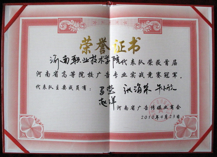 日前,在河南省首届大河杯广告创意大赛暨河南财经学院首届广告节上,我院环境艺术工程系广告策划专业代表队荣获河南省首届高校广告专业实战比赛团体冠军。