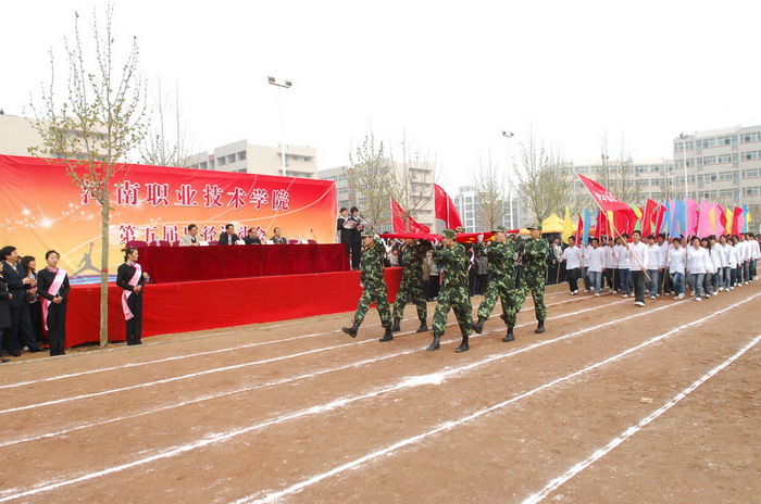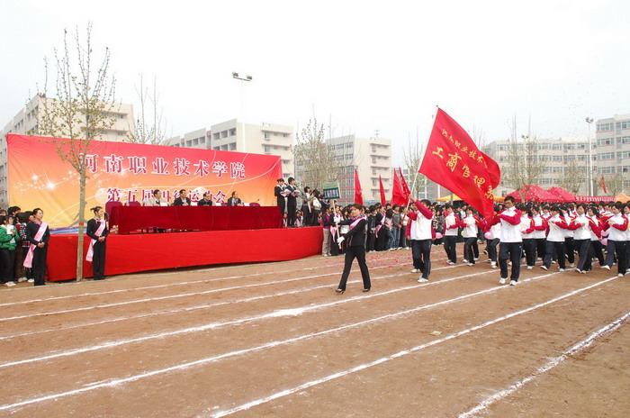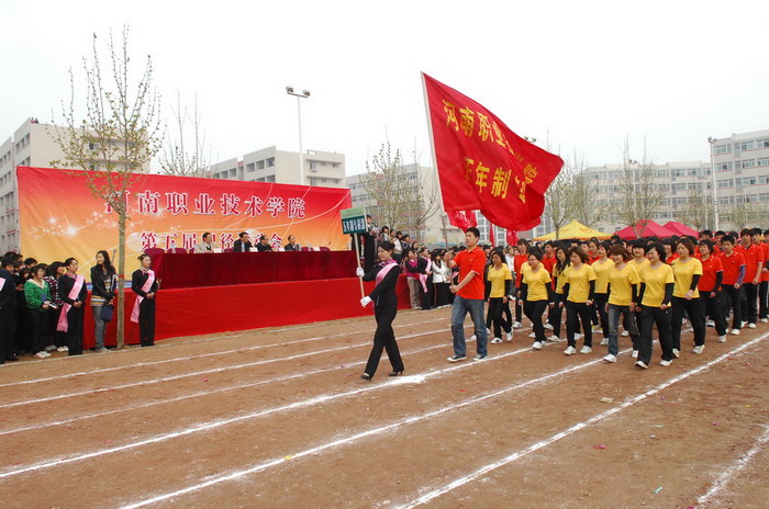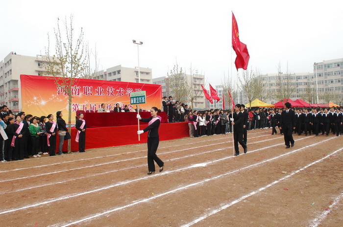 庄严嘹亮的国歌声后,院党委书记杨寿亭宣布河南职业技术学院第五届田径运动会开幕。开幕仪式上,院长王爱群同志作了热情洋溢的开幕致辞。他说,学院树立“一切为了学生,为了学生的一切”服务理念,以示范高职建设为重点,加强学院内涵建设,在教学、科研、管理等各个方面,取得了显著成绩,现已成为全国高校毕业生就业工作五十强候选单位。体育教育是学院教学工作的重要组成部分,伴随着学院办学层次的提升,我院体育运动有了较快的发展。广大师生积极投身于形式多样的体育运动,不仅丰富了校园文化生活,也为学院各项事业的发展注入了生机和活力。本届运动会不仅是对我院体育运动的检阅,也是全院学生精神面貌的展示。他预祝本届运动会圆满成功。随后,运动员代表和裁判员代表分别作了宣誓发言。