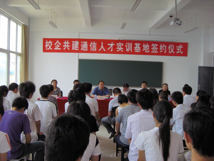 随后,校企双方领导共同签署了合作协议,并互授聘书。双方领导及代表合影后,王爱群院长和谢敬国副总经理为通信人才3G基站实训基地揭牌。