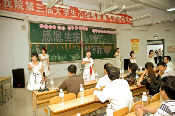 为迎接5月25日全国大学生心理健康宣传日以及河南省高校大学生心理健康教育宣传周的到来,学院于2009年5月25日至31日举办了第三届大学生心理健康宣传周系列活动。本次活动采取网络、广播、挂图、展板、条幅等多种宣传形式,放映《穿普拉达的女王》、《蒙娜丽莎的微笑》等7场次经典心理影片,“感恩生活、我写我心”征文比赛共收到229个参赛作品,旅游烹饪系的郑秀丽同学获得一等奖,其它18位同学分获二、三等奖和优秀奖,环境艺术工程系、机械电子工程系、旅游烹饪系和工商管理系荣获先进集体奖。在颁奖大会上,学院领导为获奖的个人和集体颁发了荣誉证书和奖品。
