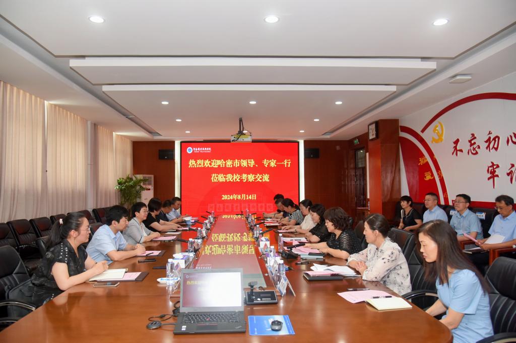 8月14日下午,哈密市人民政府党组成员、副市长滕春玲,哈密市委教育工委常务副书记、市教育局党组书记、副局长赵丽,哈密市委教育工委副书记、市教育局党组成员、副局长张哲,哈密职业技术学院党委书记王瑞生,新疆铁道职业技术学院党委书记陈光,哈密职业技术学院党委委员、副院长史富强等一行8人来校考察交流。河南省教育厅党组成员、副厅长朱自锋,职成教处副处长任远,校长夏新颜,校党委副书记、工会主席田华,副校长肖珑和李玉峰出席会议。会议由肖珑主持。