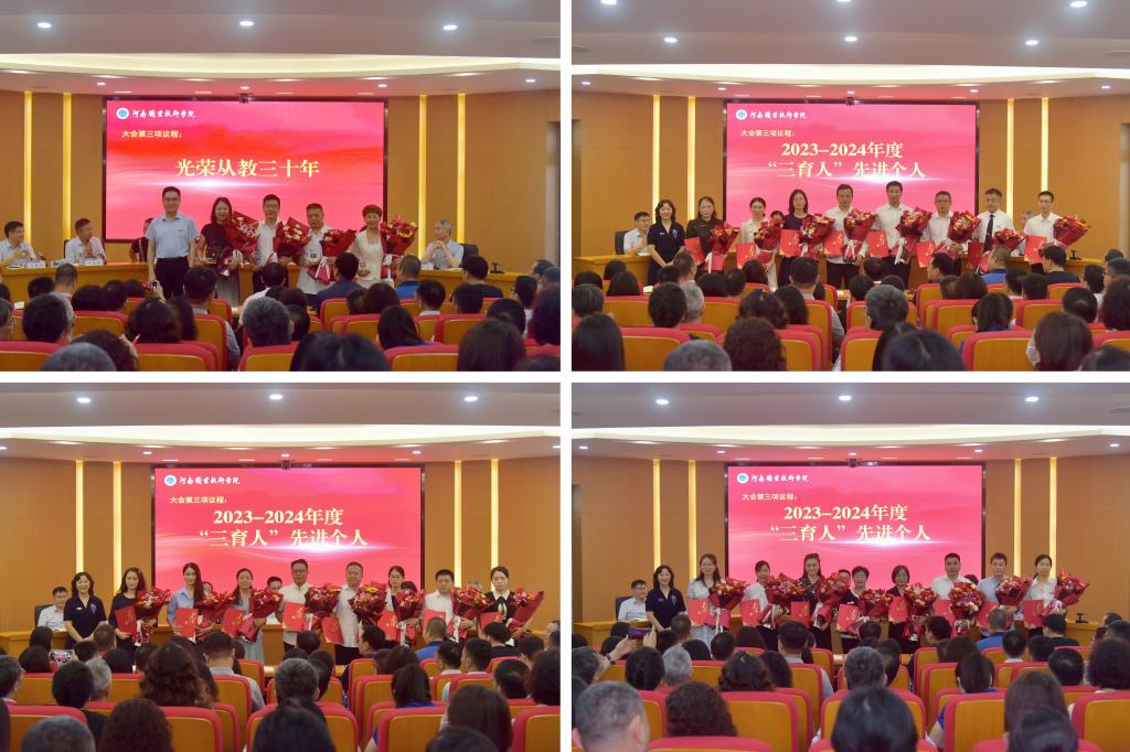 会上,全体教师齐唱国歌,并重温教师誓言;纪委书记盛兴文宣读《关于表彰光荣从教三十年教师的决定》和《关于表彰2023-2024年度“三育人”先进个人的决定》文件;厉励和夏新颜分别为光荣从教三十年的教师和“三育人”先进个人颁发荣誉证书和纪念品;梁杰、丁玉涛、蔡豪、霍书海等四位教师代表,分别结合自身工作经历从从教初心、育人使命、工作感悟等方面分享了教育心得体会;学生代表赵嘉伟结合在校学习经历、参赛经历分享了感念师恩的肺腑之言。