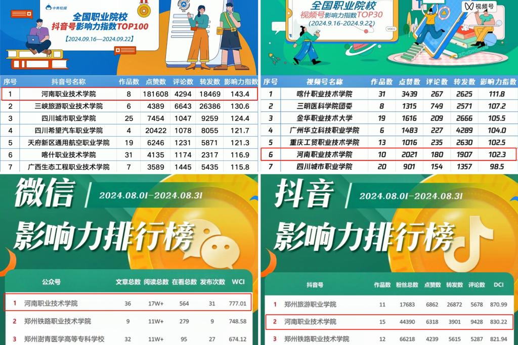 近日,在中青校媒公布的全国职业院校抖音号、视频号影响力指数排行榜(9.16-9.22)中,学校官方抖音号位居影响力指数第一位、官方视频号位居影响力指数第六位;在河南省教育厅公布的8月份全省教育系统新媒体榜单中,学校官方微信公众号位居全省高职高专影响力第一位、官方抖音位居全省高职高专抖音影响力第二位。
