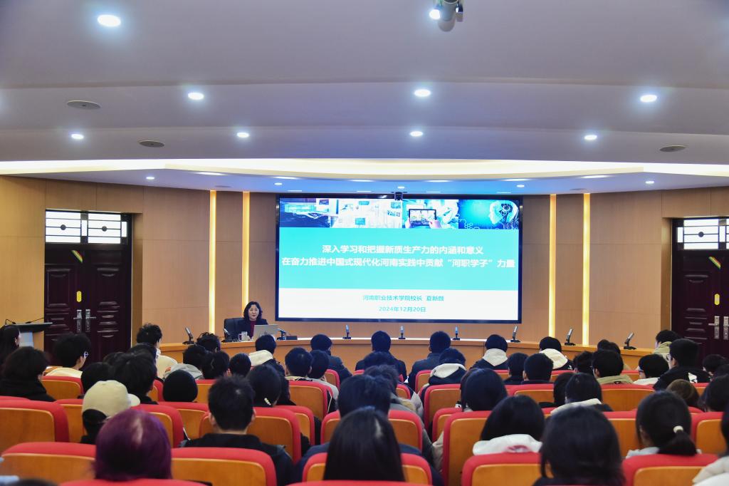 夏新颜围绕“什么是新质生产力”“为什么要发展新质生产力”“我省如何因地制宜发展新质生产力”“我校如何更好地服务河南制造业强省建设”“青年学生如何担负起中国式现代化河南建设的时代使命”等五个方面,采用问题链式方法,结合生动翔实的案例,层层递进,深入浅出,对新质生产力的内涵、发展新质生产力的重大意义、河南省因地制宜发展新质生产力、学校主动对接“7+28+N”产业链群加强专业建设和深化产教融合等方面进行全面系统深入解读。