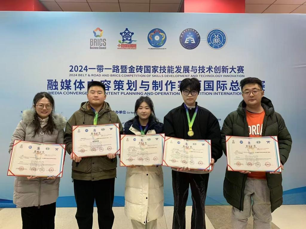 日前,2024“一带一路”暨金砖国家技能发展与技术创新大赛第二届融媒体内容策划与制作国际总决赛在北京落下帷幕。学校数字创意与设计学院学生刘佳怡、齐茄羽、杨金掏组队参赛,获高职组一等奖;王珺、王兆阳获优秀指导教师奖;学校获最佳组织奖。