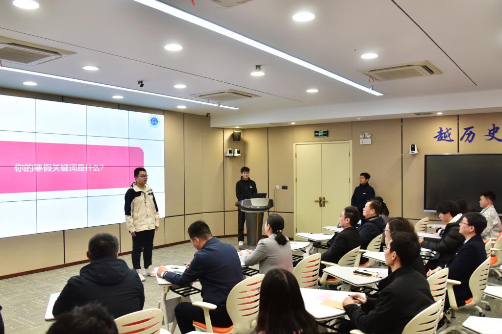 主题班会上,师生观看了同学们精心制作的寒假生活短视频;班长刘人源从年味、家乡美和志愿行三个方面详细汇报了班级同学的寒假生活情况;李岩等三名学生代表结合各自生活实践和志愿服务等经历,分享了寒假生活所思所想、所感所悟。厉励对主题班会的效果和同学们的表现给予充分肯定,并希望大家在今后的假期生活中要多尽孝道、多学本领、多思考职业发展规划,努力成长为堪当民族复兴重任的时代新人。