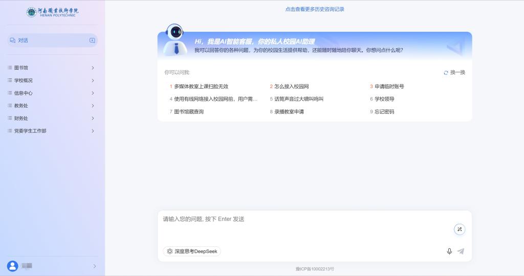 “i河职”依托DeepSeek、通义千问等大语言模型的语义理解与逻辑推理能力,深度整合学校网站数据,融合校内知识库资源,实现了7×24小时智能应答。“i河职”可针对学校规章制度解析、生活服务指南、人脸识别问题,实现一键获取。同时,在教学方面,教师可通过“i河职”生成教案模板、设计课堂互动环节,提升备课效率;学生可通过“i河职”解析学科知识点,获取个性化学习计划建议,真正实现“有问必答,答即所需”。