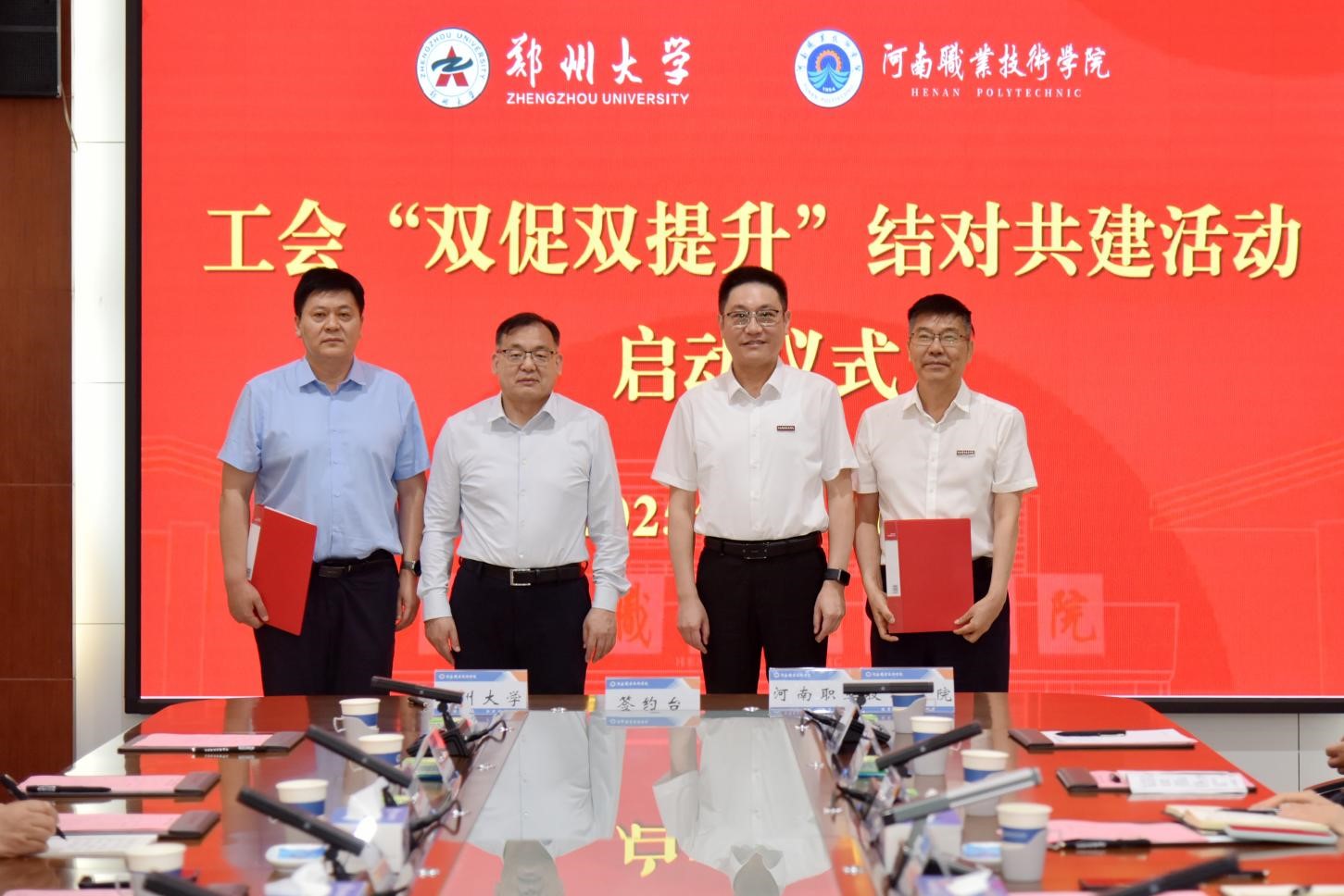 6月11日下午,河南职院与郑州大学在学校勤业楼举行工会“双促双提升”结对共建签约仪式。郑州大学党委副书记、工会主席韩国河,校党委书记厉励出席签约仪式并致辞。郑州大学工会副主席杨根顺,校党委委员、副校长朱永宽参加签约仪式。校党委副书记、工会主席田华主持签约仪式。