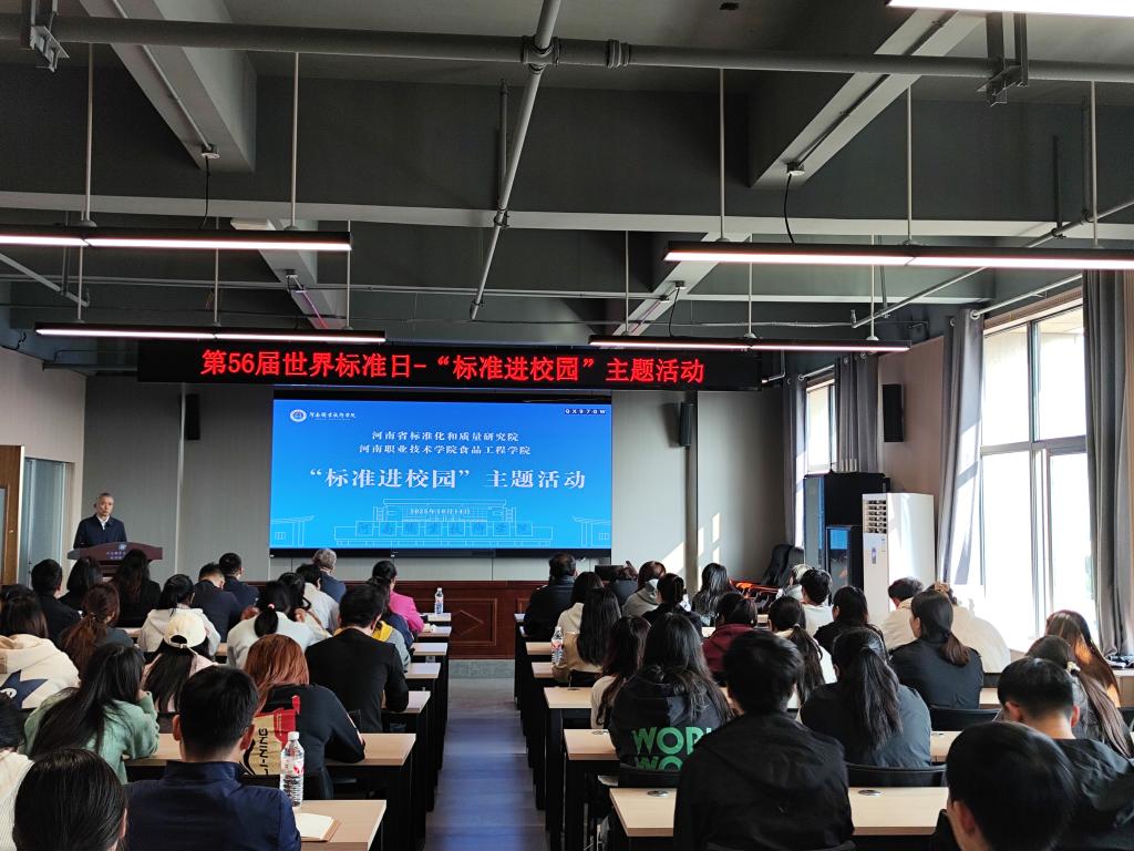 郭敬东代表河南省标准化和质量研究院宣读第56届世界标准日祝词,深刻阐释了“美好世界的共同愿景:增强伙伴关系,共促可持续发展”的主题内涵。他指出,标准化是跨越地域、连接产业的“通用语言”,而高校作为人才培养的“源头活水”,只有将标准理念融入教育全过程,才能为行业输送“懂标准、用标准、造标准”的后备力量,这正是此次校院合作的核心价值所在,进一步深化了在场师生对标准化战略意义的认知。