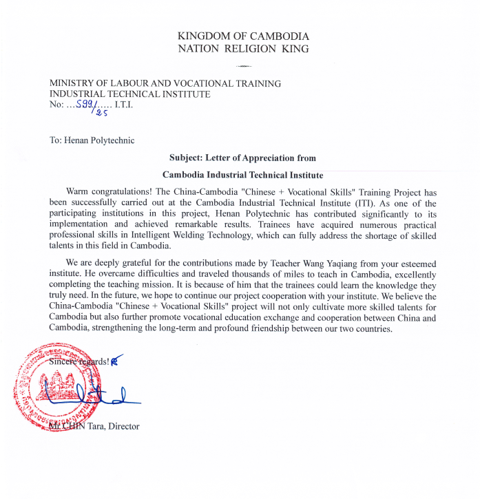 近日,学校收到来自柬埔寨劳工与职业培训部和工业技术学院发来的两封感谢信。信中写道:感谢你们为中国—柬埔寨“中文+职业技能”项目所做的贡献,王亚强老师倾心指导柬埔寨学员的敬业精神令人感佩,您凭借智能焊接技术领域的专业造诣,采用“理论+实践”双轨并行的教学模式,使学员们受益匪浅……