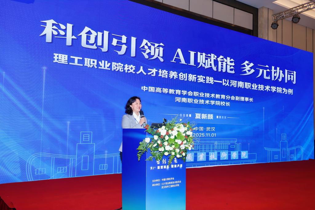 11月1日,由中国计算机学会主办、职业教育发展委员会承办的第九届CCF职业教育大会(CCVE 2025)在武汉召开。本届大会以“智创未来:AI+重塑职教,赋能产业”为主题,汇聚了全国职业教育领域的专家学者、院校代表及行业企业精英等300余人参会。中国教育科学研究院职业教育与继续教育研究所副研究员聂伟、高等教育出版社智慧职教发展中心主任周先海等嘉宾出席大会。校党委副书记、校长夏新颜受邀参加会议并作专题报告。