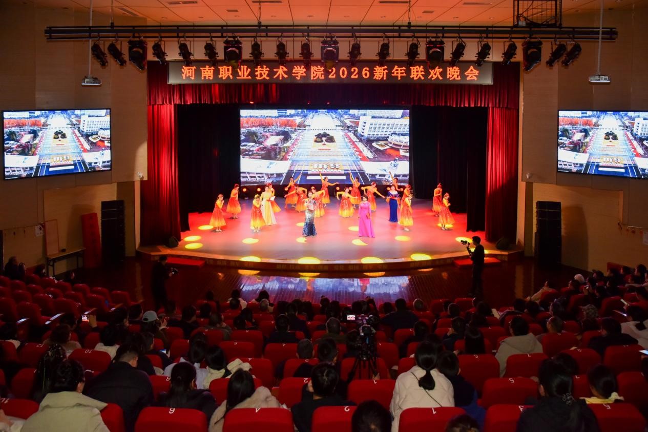 晚会伊始,厉励以《逐光而上砺初心 乘势扬帆谱新篇》为题发表学校2026年新年贺词,并代表学校党委行政,向全校教职员工、学生、离退休同志、海内外校友以及所有关心支持学校发展的社会各界朋友致以诚挚问候和美好祝福。厉励指出,2025年是学校蓝图铺展、奋进扬帆的一年,党的二十届四中全会胜利召开,为“十五五”发展擘画宏伟蓝图、教育强国建设描绘壮阔新篇、职业教育赋能中国式现代化注入磅礴动力。学校始终坚持以党的创新理论为指引,紧扣“两高四着力”重大要求,锚定“双高计划”建设和职业本科创建宏伟目标,凝心聚力、勇毅笃行,党建领航事业发展、思政育人润物无声、人才培养硕果累累、产教协同赋能升级、服务社会担当使命、幸福校园润泽心灵,共同铸就河职年度故事荣光。厉励强调,今日之河职,战略清晰、目标笃定、定位精准、举措务实、生机勃发,正以奋进之姿、昂扬之态,向着建设对河南经济社会发展具有突出贡献的高水平高职院校宏伟目标劈波斩浪、砥砺前行,要更加紧密地团结在以习近平同志为核心的党中央周围,坚持立德树人根本任务,坚守“为党育人、为国育才”初心使命,紧紧锚定学校第二期国家“双高计划”建设和职业本科创建目标,抢抓机遇、乘势而上,奋力谱写学校事业高质量发展、高效能治理、高水平安全崭新篇章。