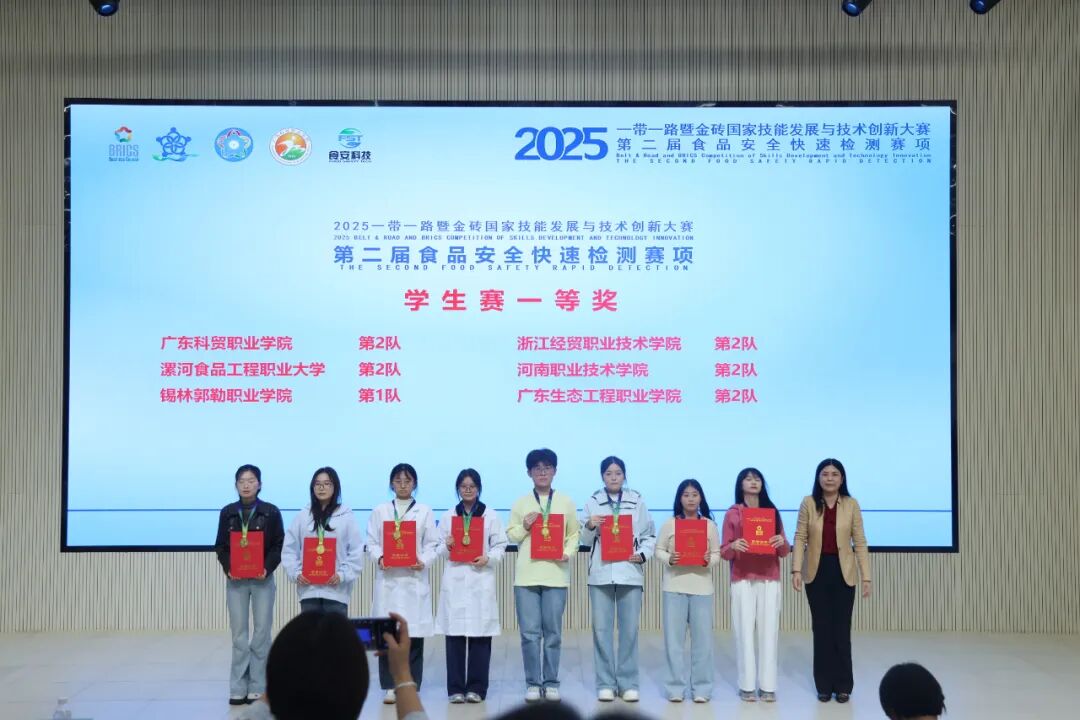 近日,2025“一带一路”暨金砖国家技能发展与技术创新大赛第二届食品安全快速检测赛项全国总决赛成绩公布。学校食品工程学院学生团队凭借扎实的专业基础、规范的操作技能和出色的临场发挥,从全国75所院校的500余名参赛选手中脱颖而出,勇夺一金一银,充分展现了学校在食品质量与安全领域的教学实力和人才培养成效。