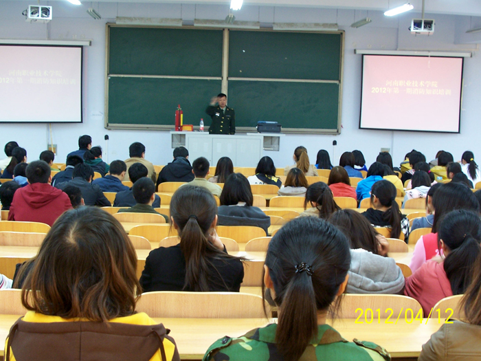 4月12日下午,保卫处举办了我院2012年第一期消防知识培训暨灭火演习活动。各单位消防管理人员和师生共200人参加。郑东新区消防大队队长李功勇和省消防协会宣讲团教员陈艳峰为与会人员作了消防知识培训,并现场指导灭火演习。