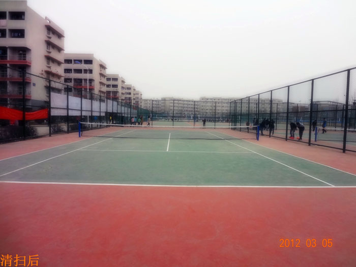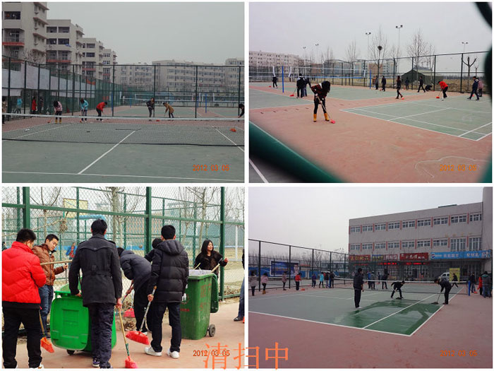 当天上午十点半, 10级计应专业93名同学自带工具开始了清扫活动。活动中大家发扬不怕苦、不怕脏、不怕累的作风,下不了工具的缝隙就用手去掏,绝不放过每一个角落。经过近两个小时的清扫,700多平方的网球场、羽毛球场、排球场、篮球场又恢复了崭新的面貌。