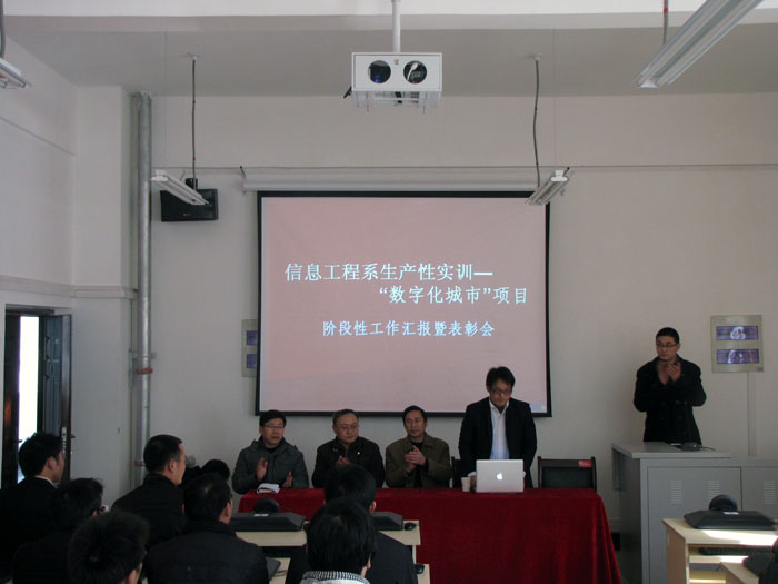 12月15日下午,信息工程系生产性实训 “数字化城市”项目阶段性工作汇报暨表彰会在综合楼302室隆重举行。信息工程系党总支书记李明玉,副主任孙杰、谭营军、赵大鹏,河南角色人公司总经理李长青及相关项目负责人出席了本次表彰会。