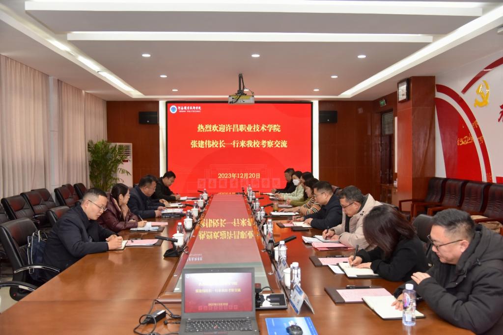 12月20日上午,许昌职业技术学院校长张建伟一行到河南职业技术学院调研交流“双高”建设经验。校长夏新颜出席座谈会,发展规划处、教务处、科技开发处、国际合作交流处、智能制造学院和文化旅游学院等相关单位负责人参加座谈。
