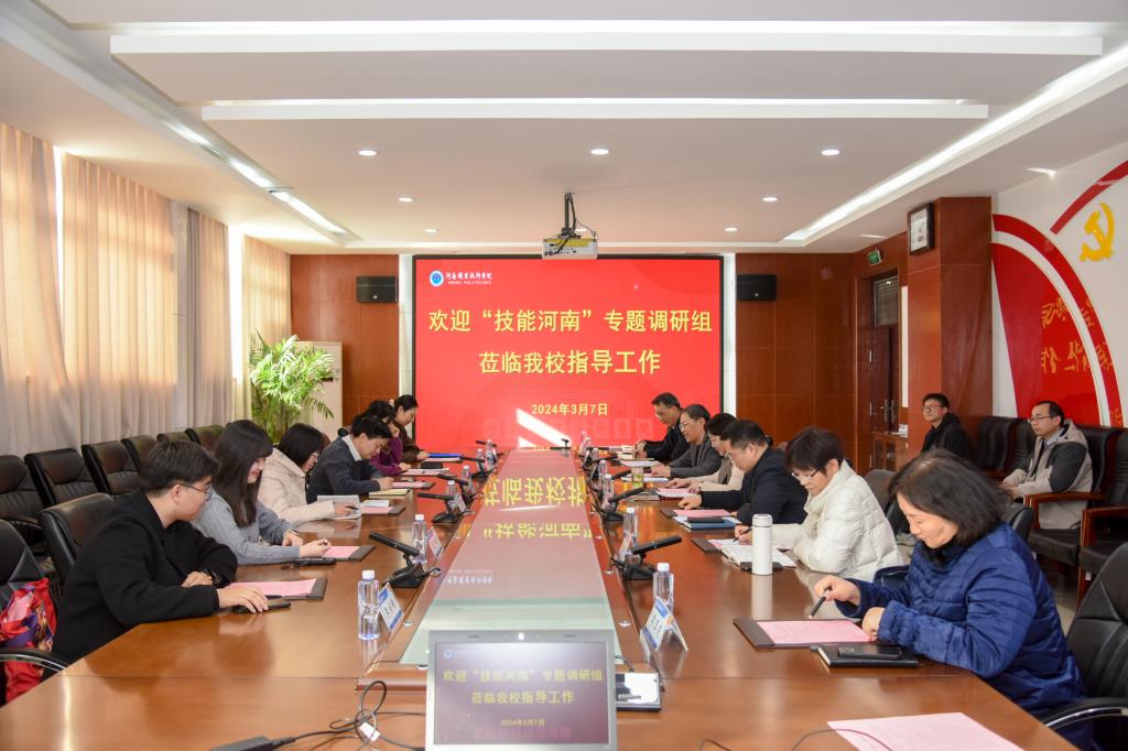 3月7日下午,河南省社科院党政办公室主任、研究员王宏源带领“技能河南”专题调研组来校,就高技能人才培养工作开展专题调研。校长夏新颜出席座谈会并致辞,智能制造学院、数字创意与设计学院、汽车与交通学院和综合实训中心等有关部门负责人参加活动。