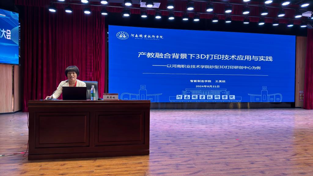夏新颜作为河南省3D打印产业技术创新战略联盟执行理事长致辞,并主持了大会主旨报告。她介绍了河南省3D打印产业技术创新联盟在产学研用融合、科技开发创新、优势资源整合等方面取得的突出成效和改革实践。学校智能制造学院院长、二级教授王美姣作了题为《产教融合背景下3D打印技术应用与实践---以河南职业技术学院砂型3D打印研创中心为例》的大会报告,分享了3D打印技术在学校推进产教融合、科教融汇过程中的经验做法。
