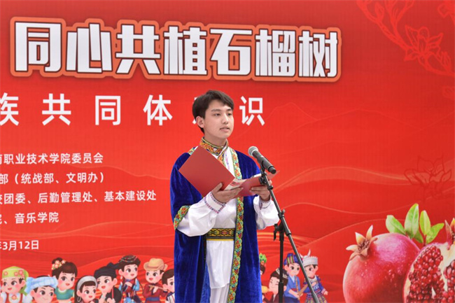 3月12日是全国第47个植树节,当天,河南职业技术学院举行了“中华民族一家亲,同心共植石榴树”活动。校党委书记厉励出席活动,为学生讲授铸牢中华民族共同体意识思政课,并为“民族团结石榴林”揭牌。校党委委员、副校长任枫轩,党政办公室、党委宣传部、党委学生工作部、校团委、后勤管理处、基本建设处和各二级学院相关负责人,以及120余名各民族师生代表参加活动。校党委副书记、工会主席田华主持活动。