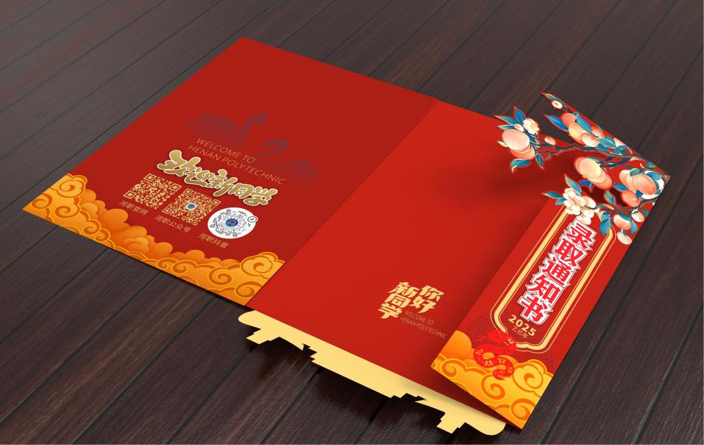 学校2025年的录取通知书由数字创意与设计学院赵永立老师设计,采用高纯度、充满活力的“中国红”作为主色调,以喜庆、热烈、庄重、现代且富有深意的视觉语言,传达了学校对2025级新生的诚挚欢迎与殷切期望,同时展现学校的办学特色、地域文化底蕴和精神风貌。