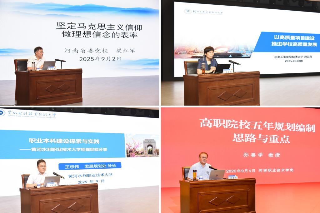 在专题辅导报告环节,河南省委党校科技文化教研部副主任、河南省首席科普专家梁红军教授以《筑牢党性根基,涵养过硬作风》为题,系统阐释了马克思主义的科学性与真理性,并就如何做坚定理想信念的表率指明了路径,为全体学员上了一堂深刻、生动的党性教育和作风建设示范课。河北工业职业技术大学总督学池云霞教授以《新双高计划高水平专业群建设要求和路径》为题,为现场学员带来了一场深入浅出、见解深刻的专题报告。她指出,要跳出职教看职教、立足产业办职教,在更大空间、更大维度上思考职业教育,推动教育强国纲要落地,对教学关键要素进行改革,塑造多元办学、产教融合新形态,培育更多大国工匠、能工巧匠、高技能人才。黄河水利职业技术大学发展规划处处长、高职教育研究室主任、学校升本办公室负责人王忠伟教授以《职业本科创建的深化路径与核心策略》为题,结合黄河水利职业技术大学的创建实践经验,解读了宏观政策,分享了实操流程,内容翔实、启发深刻,为持续推动学校治理体系和教育教学综合改革指明了实践路径。北京外国语大学国际教育学院教授,天津大学职业技术教育研究所所长、博士生导师孙善学以《高职院校五年规划编制思路与重点》为题,围绕“深化认识、提高站位”“明确要求、统筹全局”“识变应变、赢得先机”“守正创新、行稳致远”四个方面,系统阐述了五年规划编制的核心思路与关键重点,深刻阐释了规划编制的战略意义与实践路径。