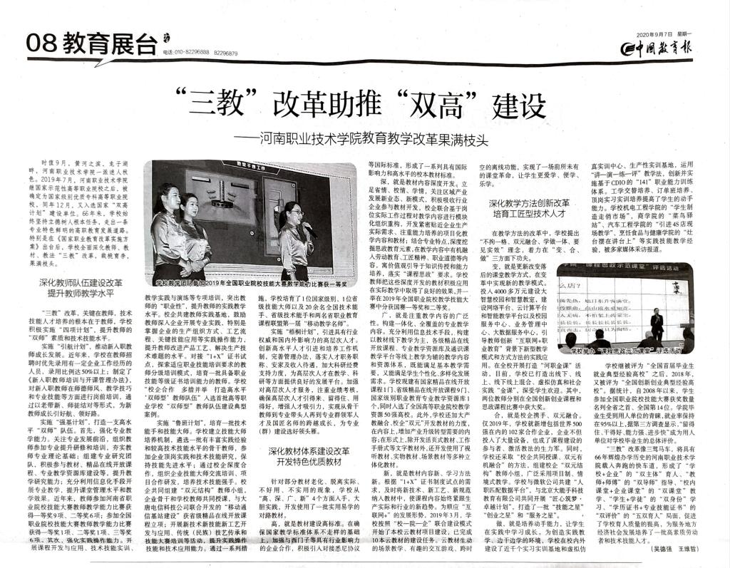 “三教”改革像三驾马车,将具有66年辉煌办学历史的河南职业技术学院载入奔跑的快车道,形成了“学校+企业”的“双主体”育人、“教师+师傅”的“双导师”指导、“校内课堂+企业课堂”的“双课堂”教学、“学生+学徒”的“双身份”学习、“学历证书+专业技能证书”的“双评价”的“五双育人”局面,促进了学校育人质量的提高,为服务地方经济社会发展培养了一批高素质劳动者和技术技能人才。(吴德强 王维哲)