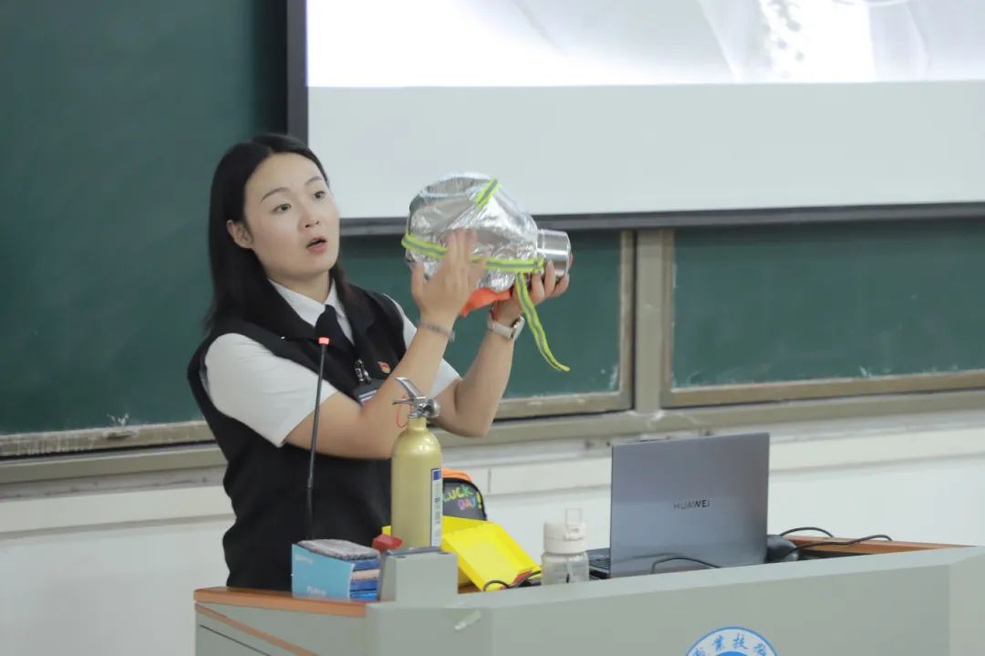 刘宁宁首先通过播放一系列火灾事故的视频资料,向在场同学直观地展示了火灾的巨大破坏力和危险性。视频中的熊熊大火、滚滚浓烟令人触目惊心。人们在火灾中的惊恐与无助,也让大家深刻认识到消防安全绝不容忽视。随后,她从火灾的危害、日常防火、消防报警和逃生、常用灭火方法、灭火器的选择和使用方法等具体问题进行了详细的讲解。