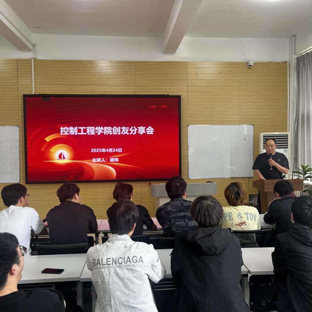 4月24日下午,学校控制工程学院在智行楼举办了优秀学长创友分享会。学校电子信息工程技术专业电子104班毕业生、郑州快易达电气维修有限公司总经理胡伟应邀回校作经验分享。