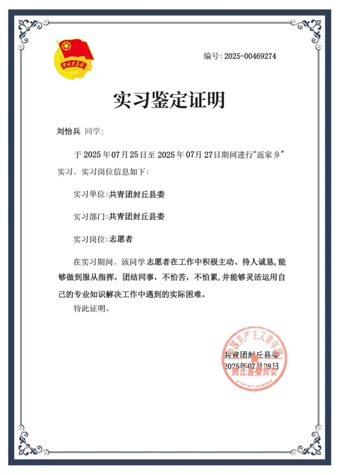 网联244班刘怡兵,投身志愿实践,彰显青春担当。暑期期间,刘怡兵怀揣热忱,奔赴共青团封丘县委投身志愿服务。他躬身实践,以谦逊之态融入基层;勤勉务实,用专业智慧破解难题。他以青春的朝气,在平凡岗位上默默奉献,生动诠释了汽车学子的责任担当,为基层工作注入蓬勃活力。