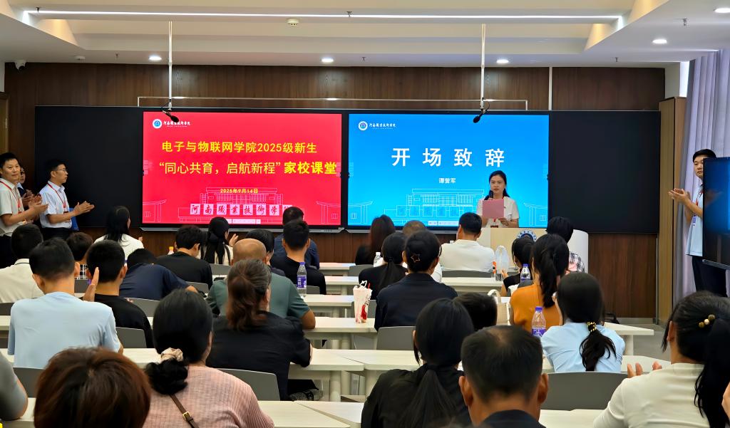 9月14日下午,学校电子与物联网学院2025级新生“同心共育 启航新程”家校课堂在合鼎楼717学术交流室举行。学院领导班子、各教研室主任及全体辅导员与近百名家长齐聚一堂,以专业为基、以沟通为桥,搭建家校共育平台,共促学生成长成才。活动由学院党总支副书记刘竹主持。