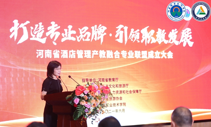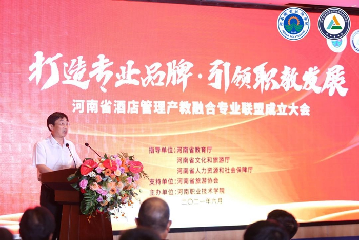 喜迎建党百年华诞,共商产教融合发展大计,6月26日上午,由河南省教育厅、河南省文化和旅游厅、河南省人力资源和社会保障厅指导,河南省旅游协会支持,我校牵头主办的河南省酒店管理产教融合专业联盟成立大会成功举办。河南省人力资源和社会保障厅党组成员、副厅长李海龙,河南省教育厅二级巡视员董玉民出席大会并致辞。省教育厅职成教处副处长张家成,世界旅游联盟副秘书长、浙江旅游职业学院王昆欣教授,省餐饮与住宿行业协会常务副会长张毅兵,省旅游协会秘书长滑蕾,以及省内51所院校和国内27家企业代表近200人参加大会。学校党委书记李桂贞致辞。学校院长梅乐堂主持了联盟成立和主题分享两个阶段的活动。