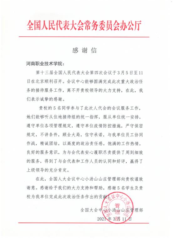 近日,全国人大会议中心小汤山山庄驻地酒店向我校发来感谢信,对我校参与此次会议接待服务工作的黄楚楚、袁永珍、李寅菲、李俊俊和王西西等5名旅游管理专业学生表示感谢。