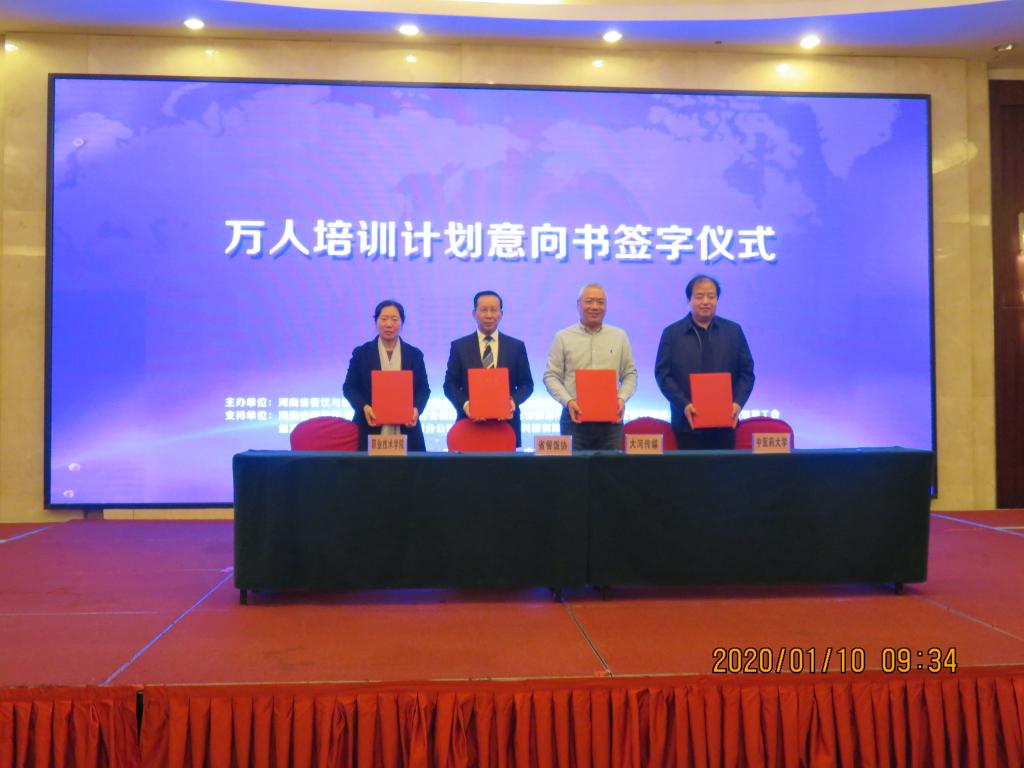 1月10日上午,由我校和河南省餐饮与饭店行业协会、河南日报报业集团、河南中医药大学共同发起的中国传统营养配餐万人培训工程计划意向书签约仪式在郑州市弘润华夏大酒店成功举行。学校副校长田华出席签约仪式,并与其他参与单位代表共同在计划意向书上签字。