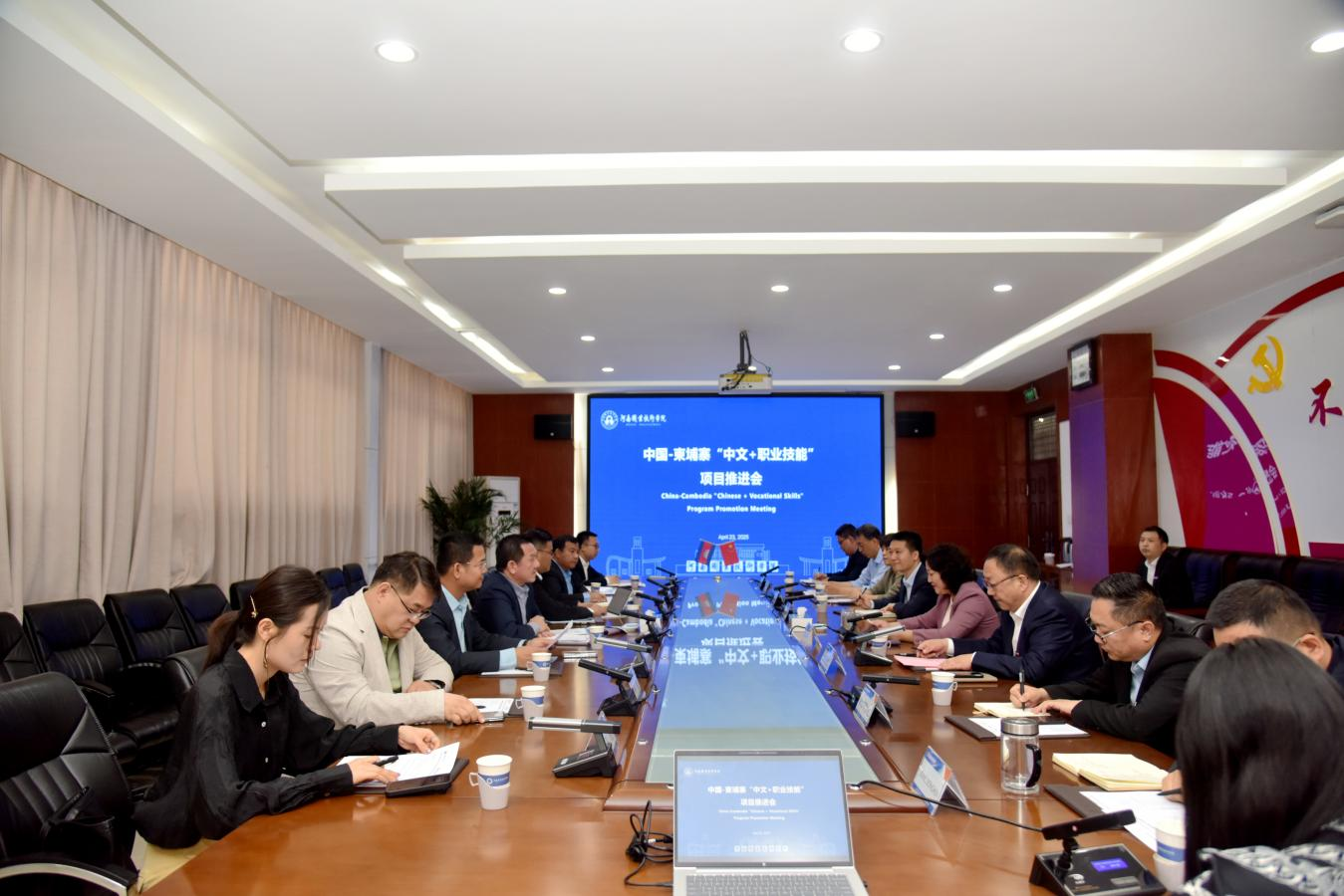 4月23日上午,中国-柬埔寨“中文+职业技能”项目推进会在我校行政楼332会议室召开。柬埔寨劳工与职业培训部副国务秘书拉彼博、劳工与职业培训部顾问吴海良、技术职业教育与培训总局副局长潘威瑟、工业技术学院副院长托克·桑努恩等柬方代表出席会议,河南联非商务信息咨询有限公司董事长吴勇等行业专家到会指导。校长夏新颜出席会议并作致辞讲话。国际合作交流处、材料工程学院、智能制造学院、控制工程学院、汽车与交通学院、国际教育学院等相关单位负责同志参与交流。会议由副校长鲁冬主持。