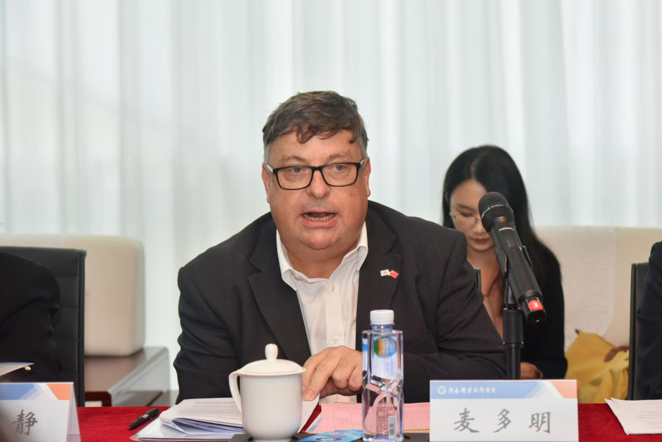 10月11日,英国驻武汉总领事麦多明(Dominic McAllister)率英国教育使团一行23人,在河南省委外办欧洲处副处长丁锐的陪同下,来我校访问交流。校长夏新颜会见麦多明一行,并与使团开展了深入的交流洽谈。会议由副校长鲁冬主持,国际合作交流处、智能制造学院等相关二级学院负责同志参与座谈交流。