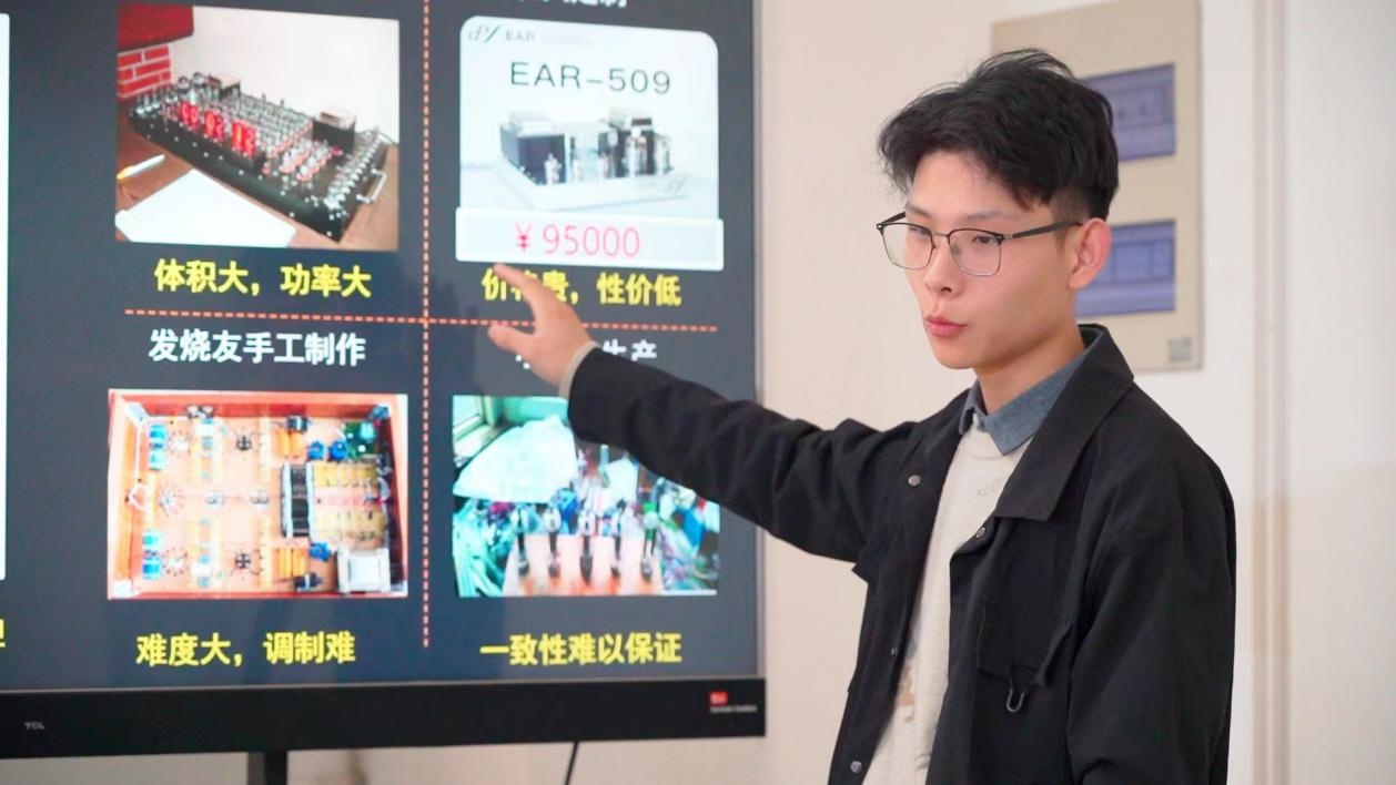 凭借着对音乐的浓厚兴趣,孟荣恩萌生了要针对音乐专业工作者制作一台价格合理、性能良好音响系统的想法。2021年3月,他主动联系了几名志同道合的朋友,结合自己的专业特长,开启了创新创业之路。在那段时间里,他全身心都投入到创业中,付出了比常人更多的努力。