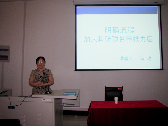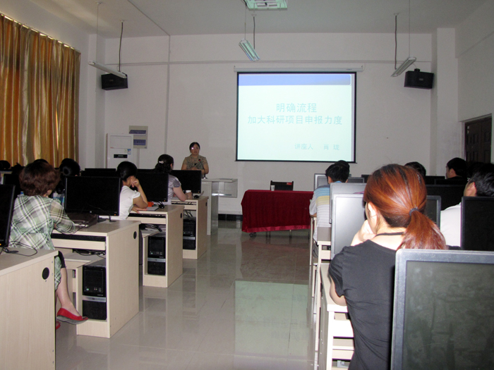 肖珑副院长在报告中详细讲解了国家级、省级和地厅级三个不同层次科研项目的来源和申报流程,并从高职 教育功能和内涵建设的角度出发,强调并勉励各位教师要以教学促进科研,以科研带动教学,不断增强我院办学实力,促进人才培养质量的提高。